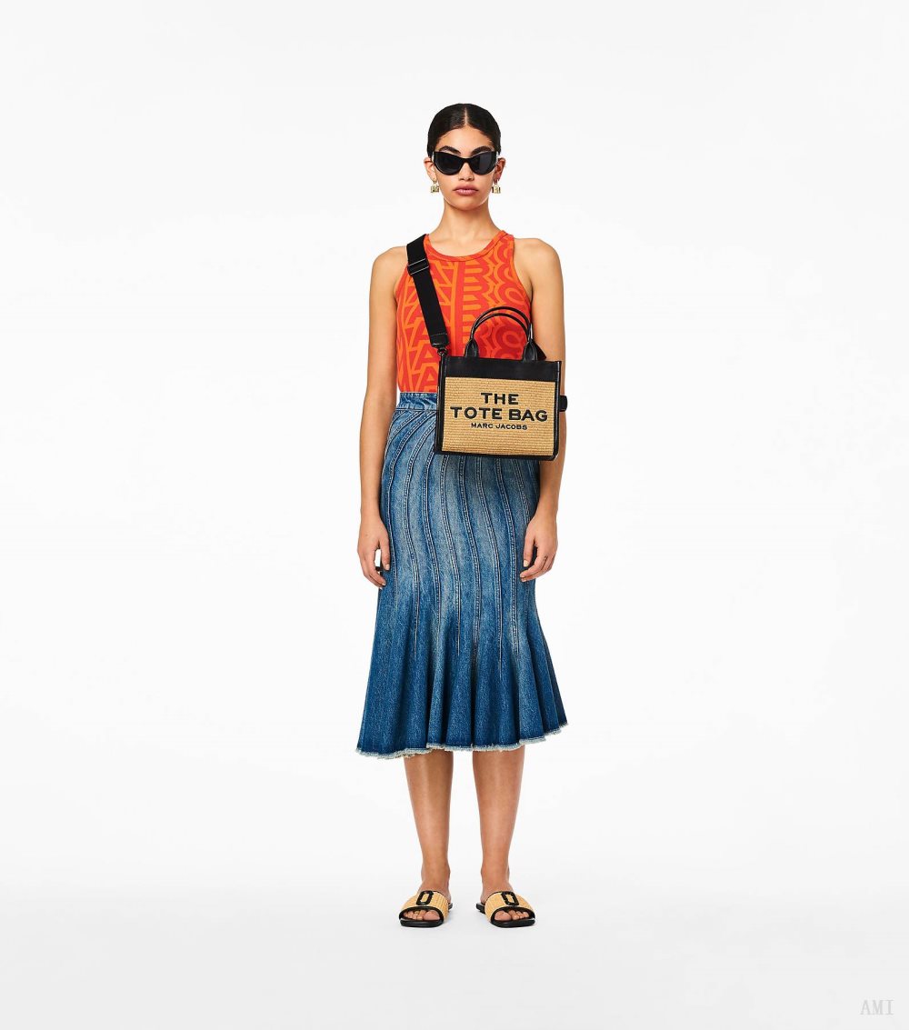 Our signature small tote bag is refreshed for summer in an all-over woven texture with contrast leather trims and matte black hardware. Inside, you'll find a pop of color with a bright orange interior lining. The bag also includes one interior zip pocket and one card slot. Wear it by the top handles or as a crossbody for hands-free styling. Explore all the different tote bag sizes in our size guide.2P3HTT051H02 Woven material; Leather trim; Twill lining Top zip closure Leather top handle; Removable and adjustable crossbody webbing strap 1 interior slip pocket, 1 card slot Dust Bag included 10in L x 5in D x 8in H 26cm L x 13cm D x 20cm H Strap 57in L x 2in D (144cm L x 4cm D) Strap Drop 27in (69cm) Handle Drop 4in (11cm)